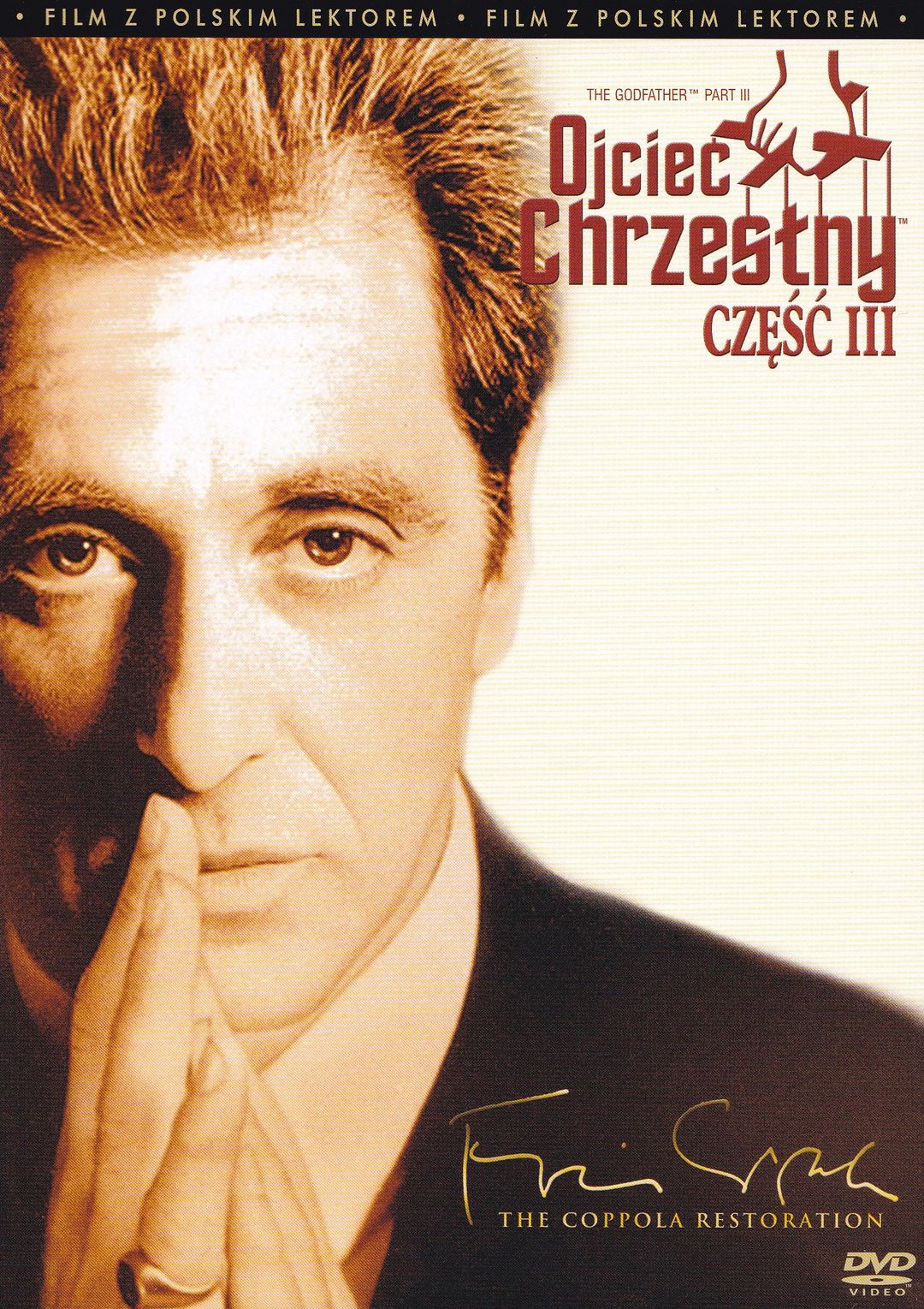 W części trzeciej "Ojca chrzestnego", Don Michael Corleone (Al Pacino) jest już człowiekiem starym. Zalegalizował swe interesy, zerwał z niebezpiecznym trybem życia. Jest szanowanym obywatelem, nie skąpiącym dolarów na szlachetne cele, za co szczególnie go ceni najwyższa hierarchia kościelna. Ale przed przeszłością nie ma ucieczki. Jego życie naznaczone zostało zbrodnią na zawsze. Al Pacino jest równie prawdziwy jako szacowny biznesmen, zmęczony demon zbrodni i załamany ojciec. Nie pasuje do świata, w którym liczy się coś więcej niż pieniądze (choć twórcy pesymistycznie oceniają jego istnienie) ani do tego, w którym rację mają tylko ludzie z karabinami. Jego czas minął bezpowrotnie.